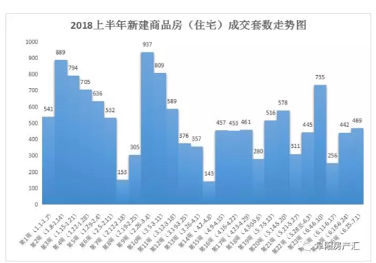 从单周成交量来看,2018年上半年阜阳新建商品房(住宅)成交最高的第9周(2月26日-3月4日),单周住宅成交937套,其次是第2周(1月8日-1月14日),单周住宅成交889套,单周最低成交套数为第14周(4月2日-4月8日),单周住宅成交143套。